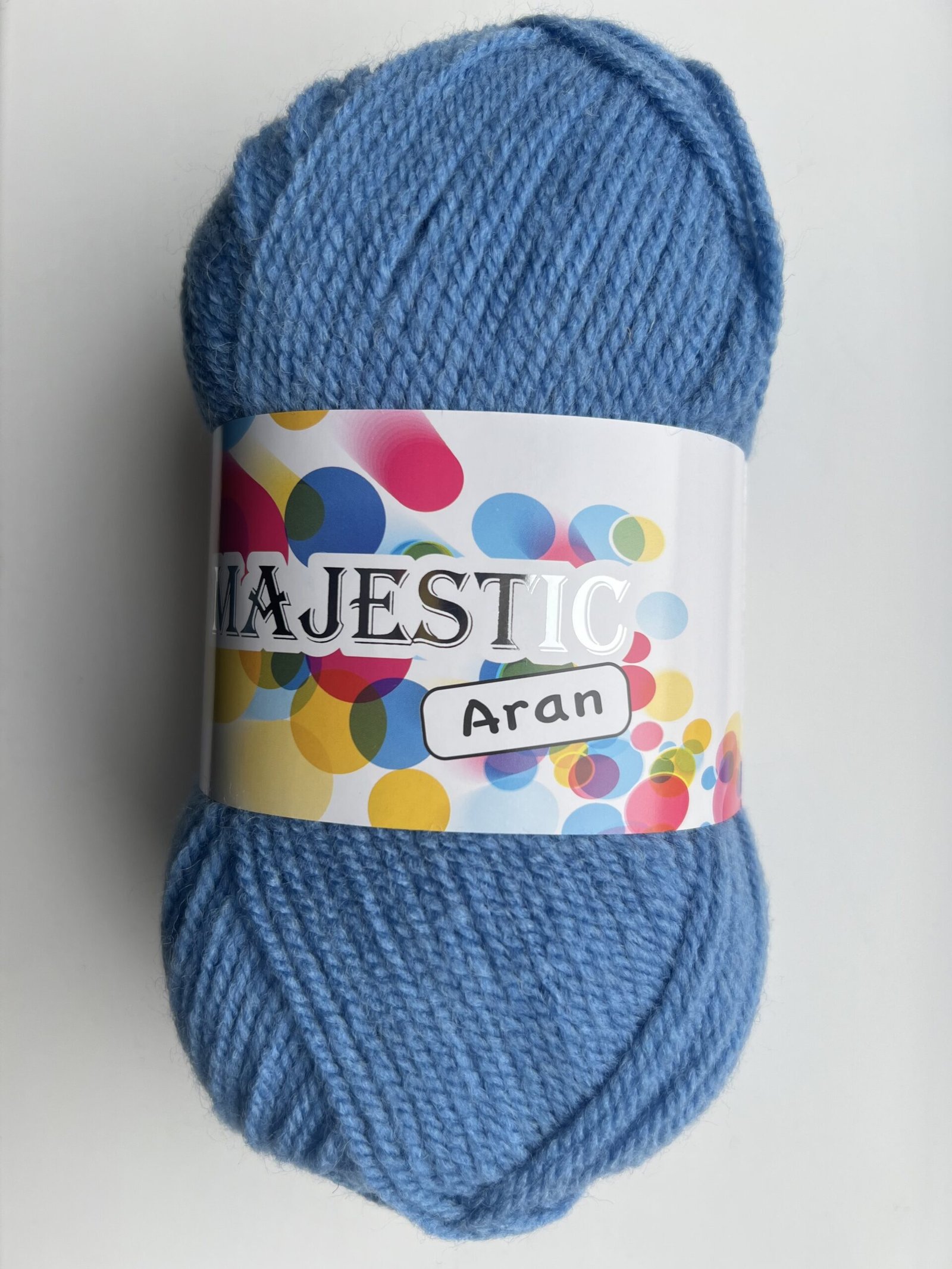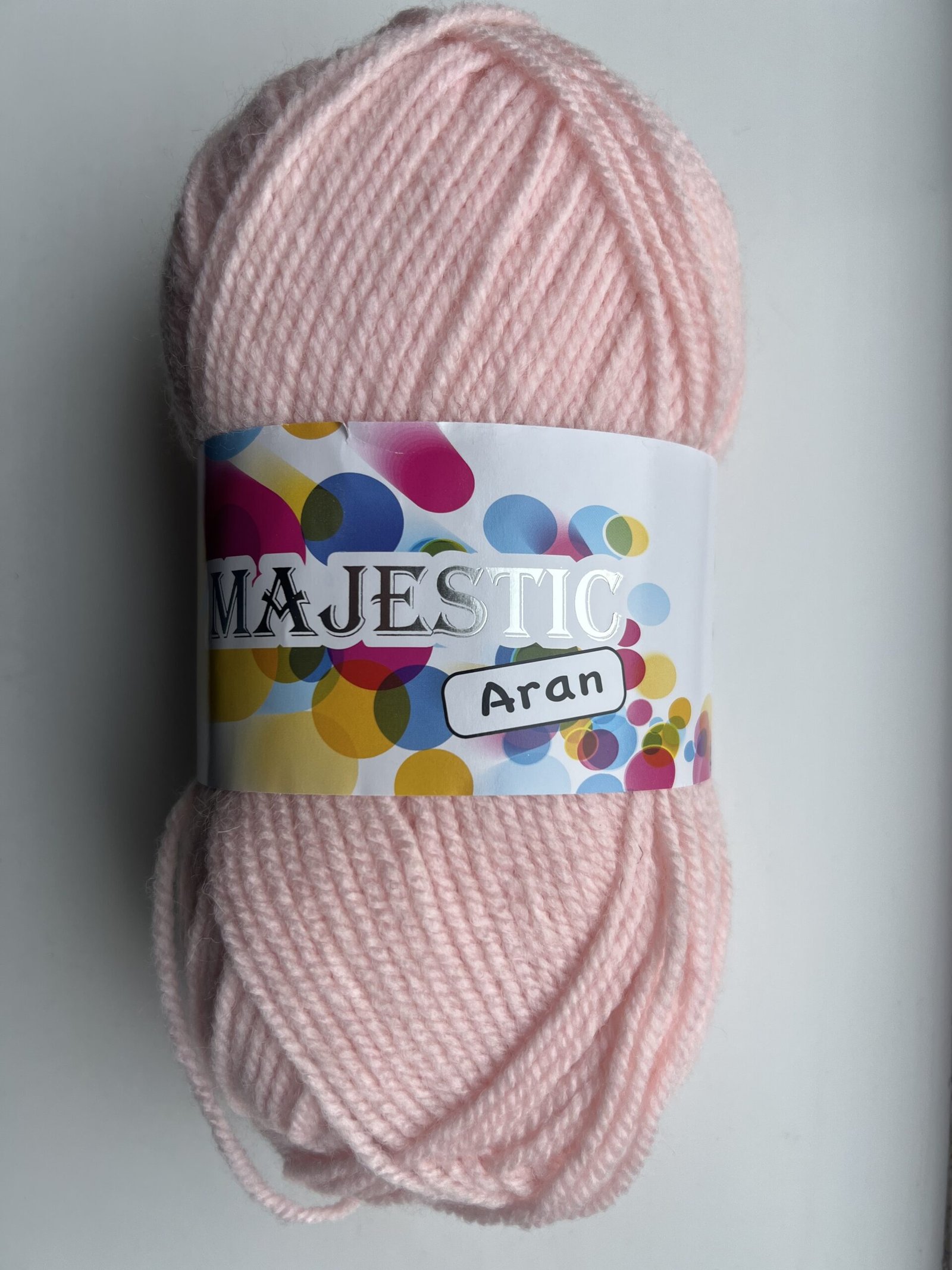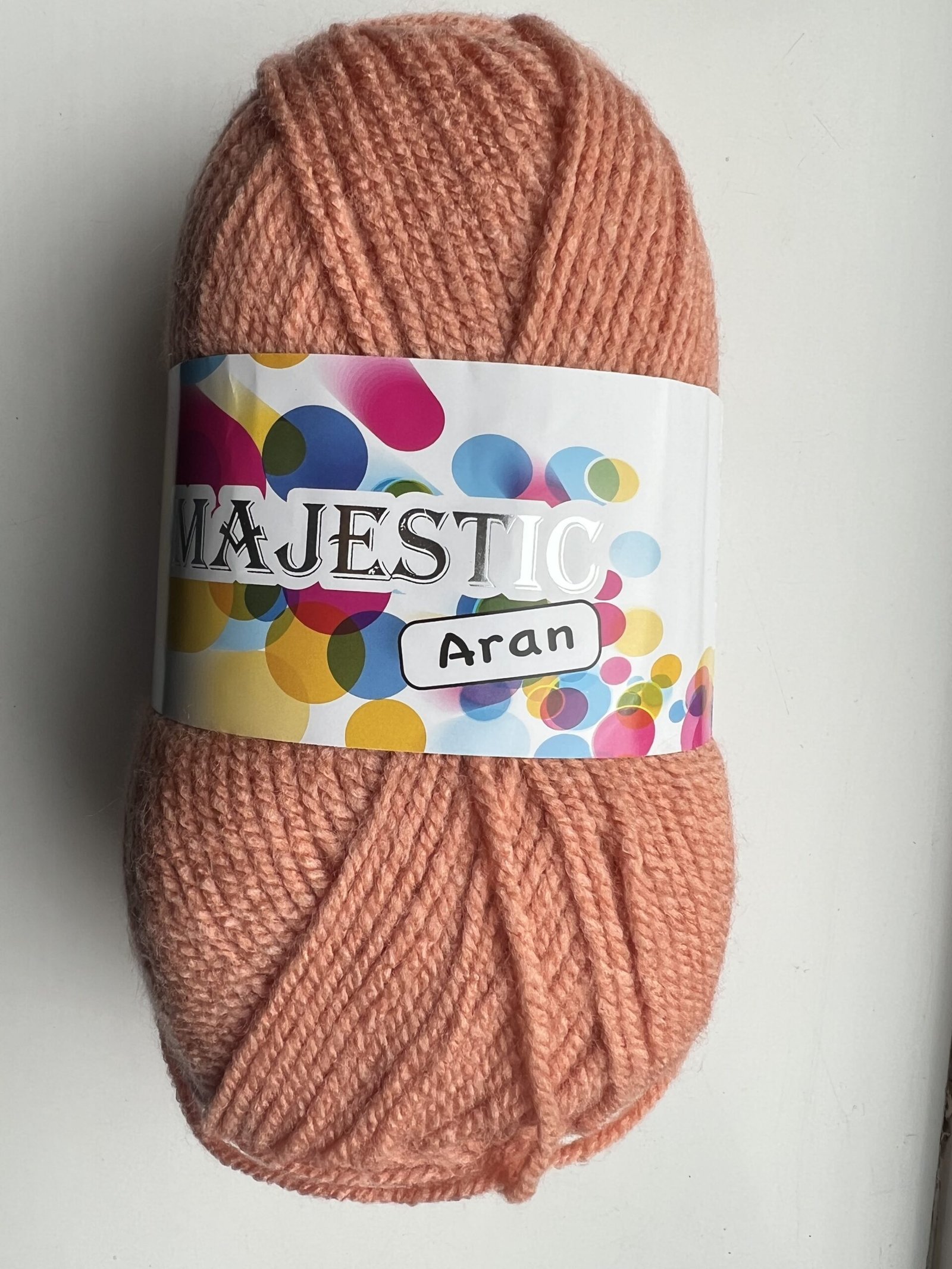 Majestic Aran 100g is a mixed fibre yarn that is mainly acrylic. It comes in 100g balls with solid and marled colours. It is aran weight and can be knitted on 5mm needles. It is a one off lot product.